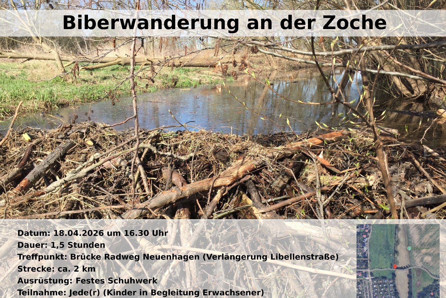 Die KGA Dahlwitzer Straße e.V. lädt am Samstag, den 18.April 2026 um 16:30 Uhr zu einer Biberwanderung für Groß und Klein ins Zochetal ein.