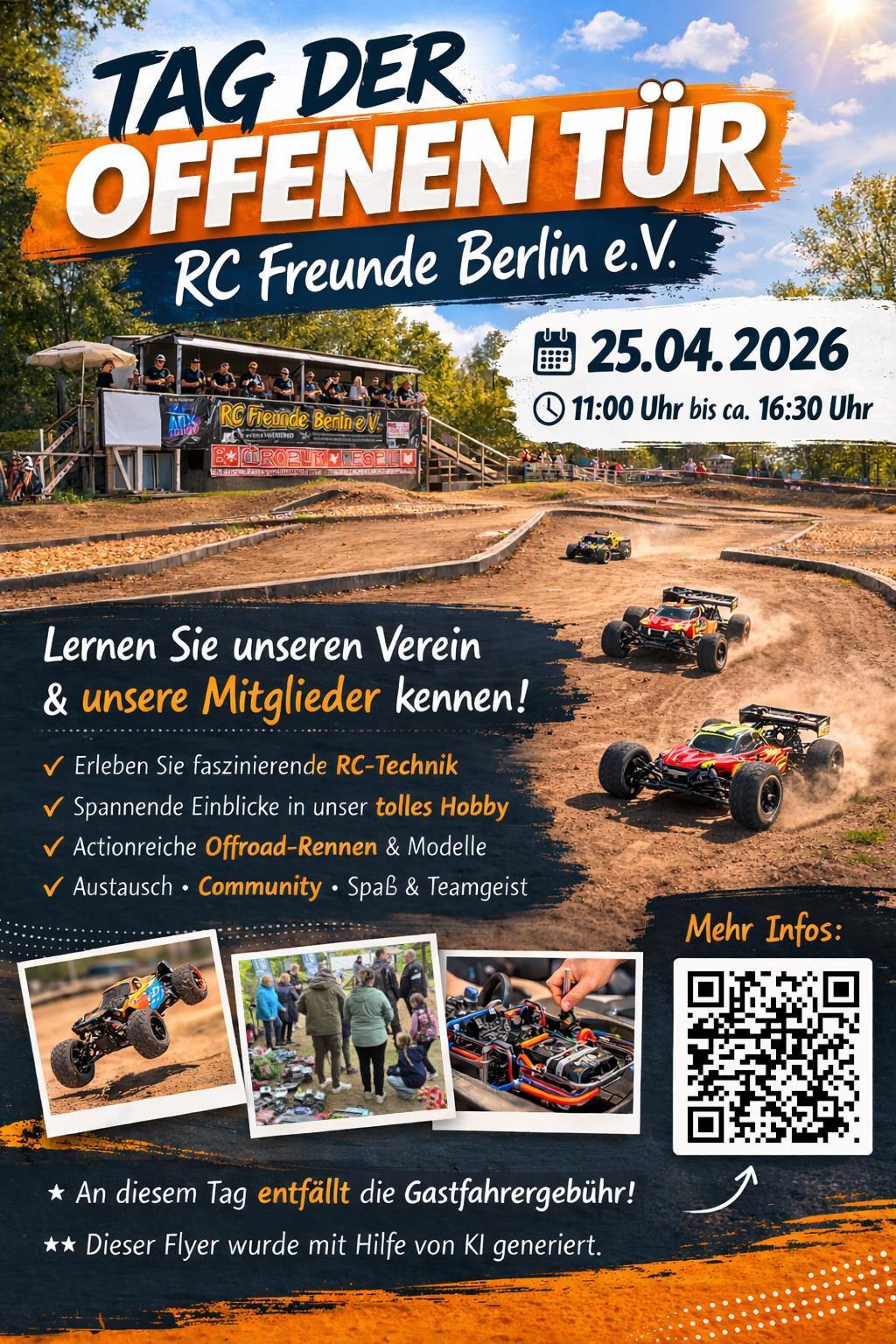 Lernen Sie unseren Verein und unsere Mitglieder kennen! Wir laden Euch recht herzlich zum Tag der offenen Tür auf unser Vereinsgelände in Berlin Mahlsdorf am 25. April 2026 in der Zeit von 11:00 bis 16:30 Uhr ein. Alle Infos: RC Freunde Berlin - Tag der offenen Tür